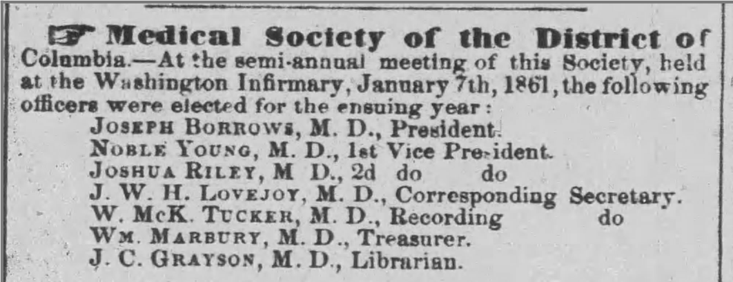 Dr. Joseph Borrows was a leading Washington, D.C physician, Daily National Intelligencer, January 9, 1861